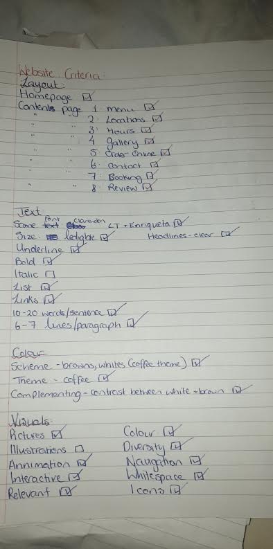 My third step was to brainstorm my website. I started by listing the businesses I could create a website for like, a café, a clothes shop, a school etc. Then once I chose a coffee shop I decided to list my aesthetic including colours, texts, and images. I referred back to my brief and saw that I had to have at least eight pages of content so I listed the pages of content I could do. This included; Home, Menu, Gallery, Review, Contact, History, Opening Hours, Products, and Locations. I also researched similar establishments like Starbucks and Costa to ensure my page felt authentic.